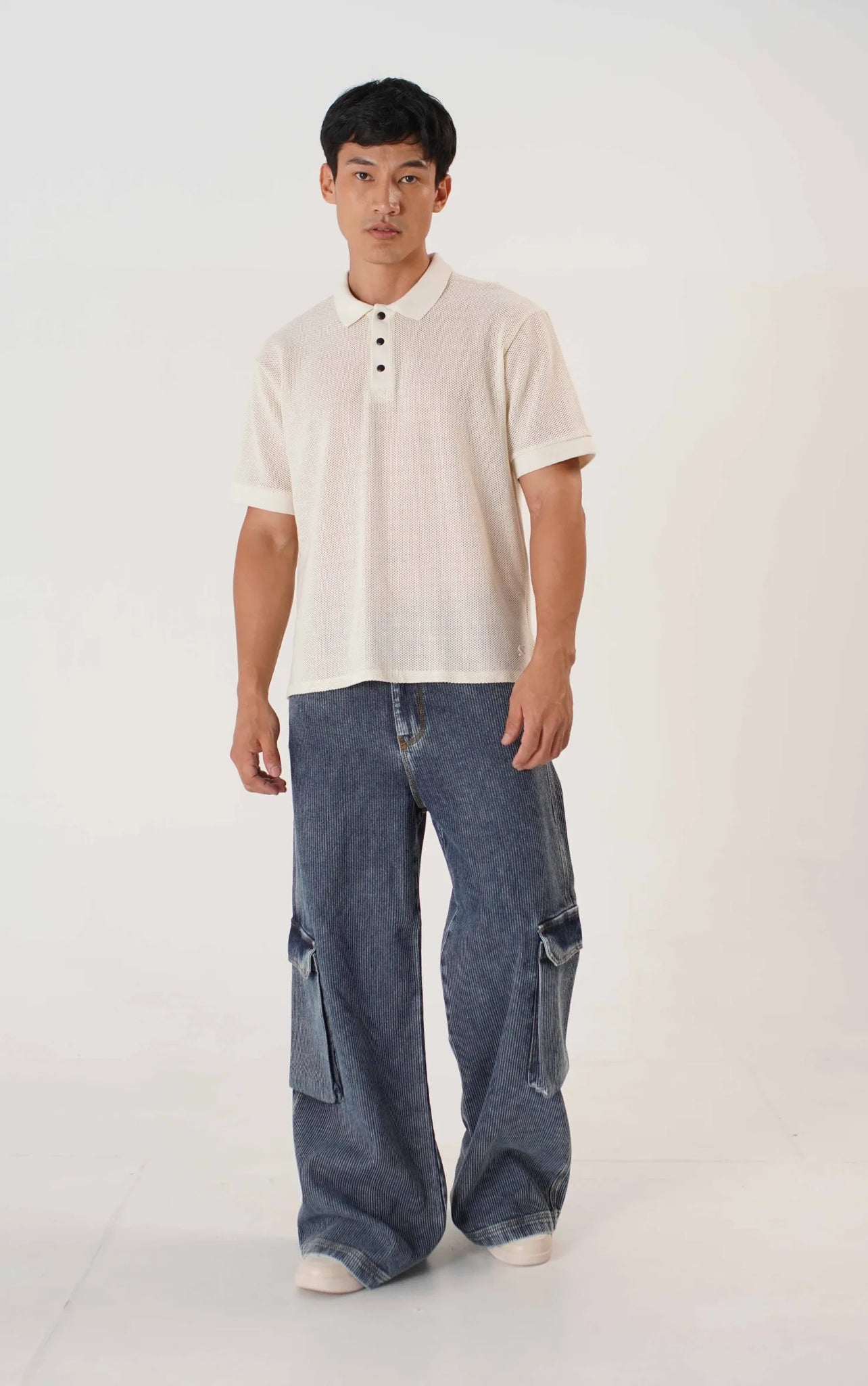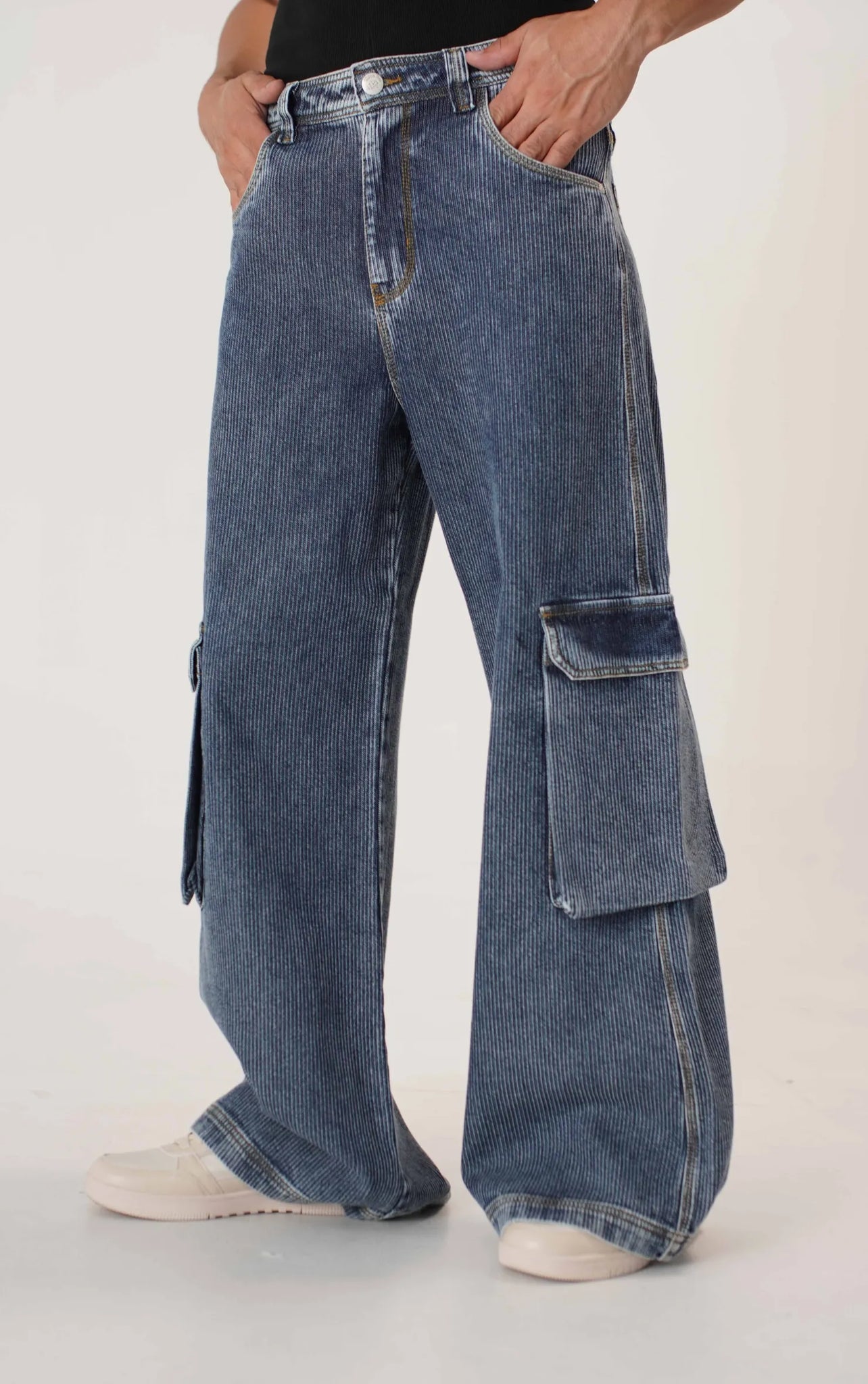Jean confeccionado en 100% algodón índigo con textura acanalada, que aporta un carácter auténtico y un look contemporáneo. Su silueta wide leg amplia y recta garantiza comodidad y proyecta un estilo urbano con inspiración cargo.