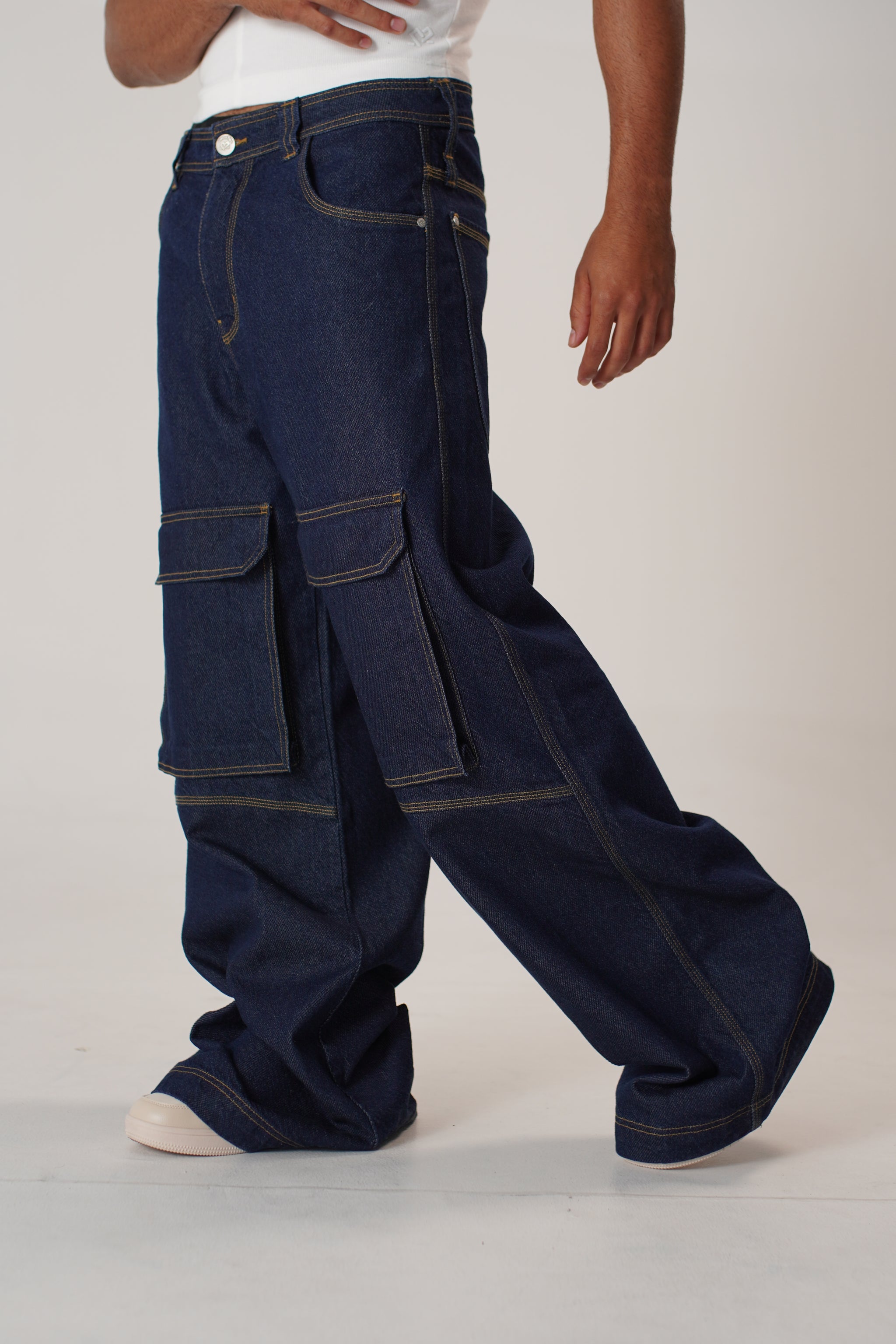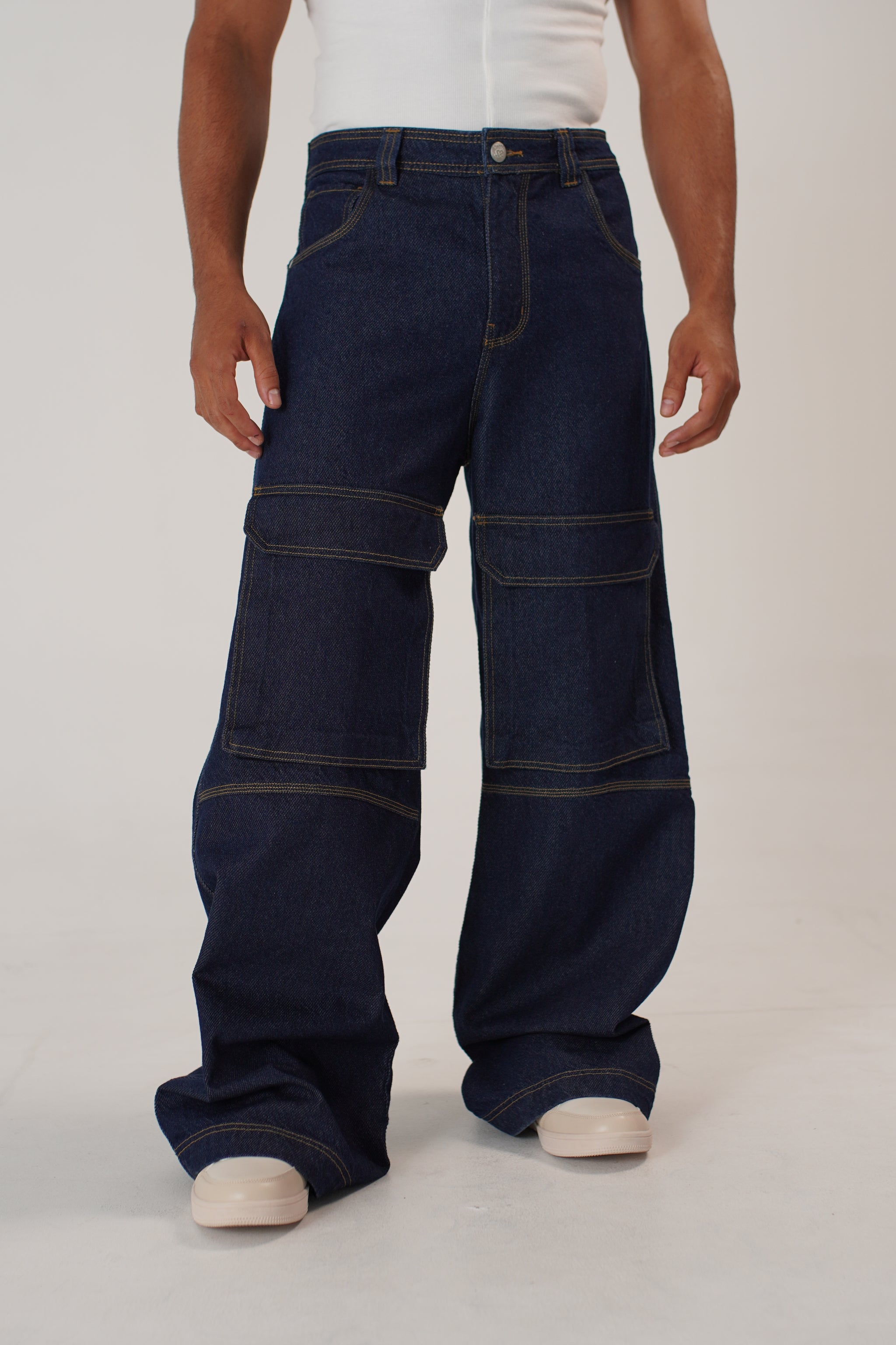 Jean cargo unisex, confeccionado en 100% algodón con tejido índigo pesado 11/11, que garantiza resistencia, durabilidad y un carácter robusto. Su silueta wide leg amplia y recta brinda comodidad con un estilo urbano contemporáneo y desenfadado.