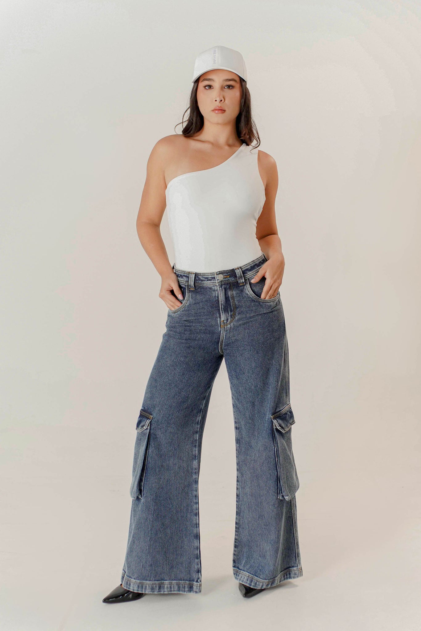 Jean unisex confeccionado en 100% algodón índigo con textura acanalada, que aporta un carácter auténtico y un look contemporáneo. Su silueta wide leg amplia y recta garantiza comodidad y proyecta un estilo urbano con inspiración cargo. El diseño destaca por su funcionalidad utilitaria, incorporando ocho bolsillos prácticos: bolsillos delanteros clásicos, bolsillos cargo laterales de gran capacidad y bolsillos traseros oversize, complementados con un bolsillo pequeño posterior con logo bordado tono a tono.