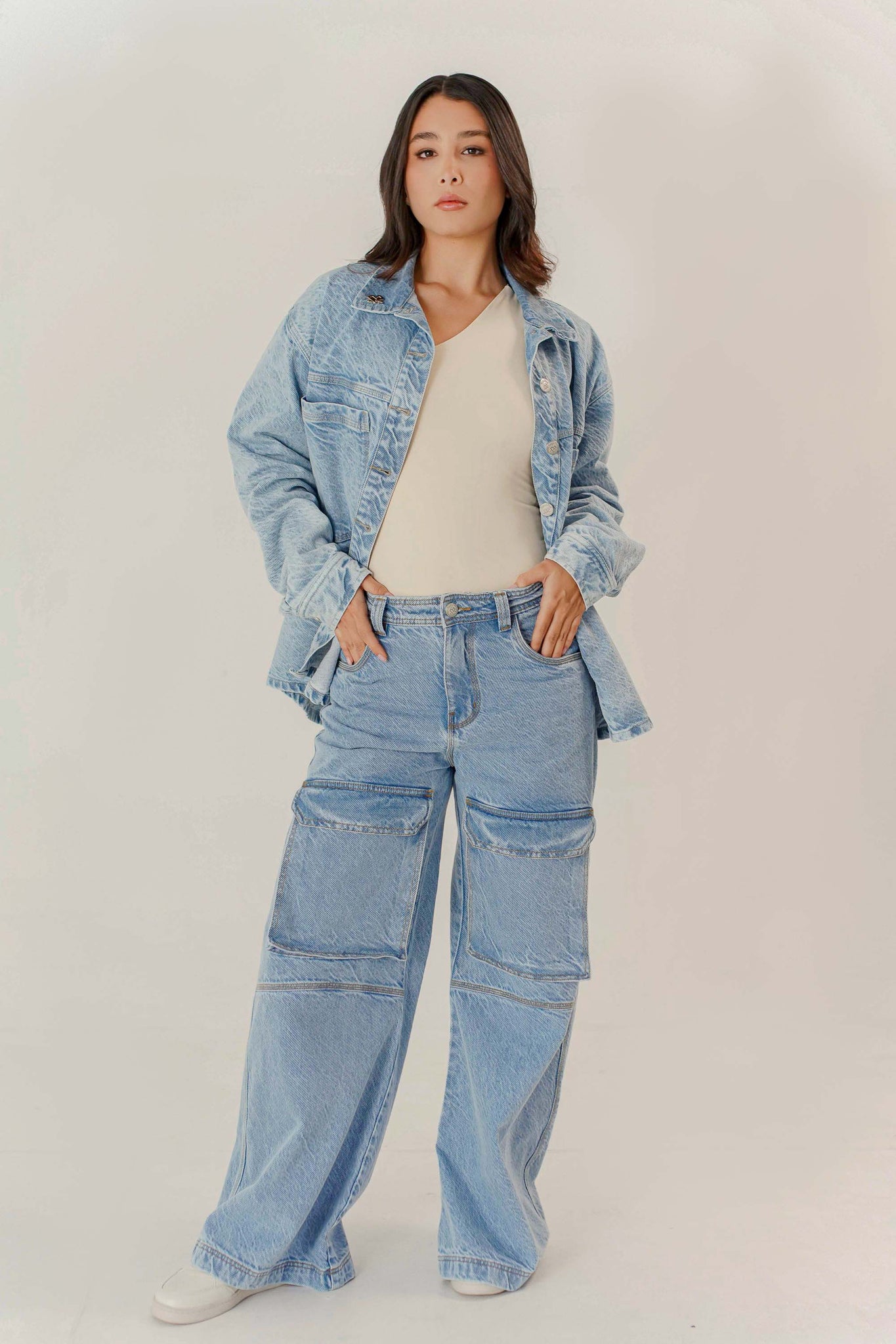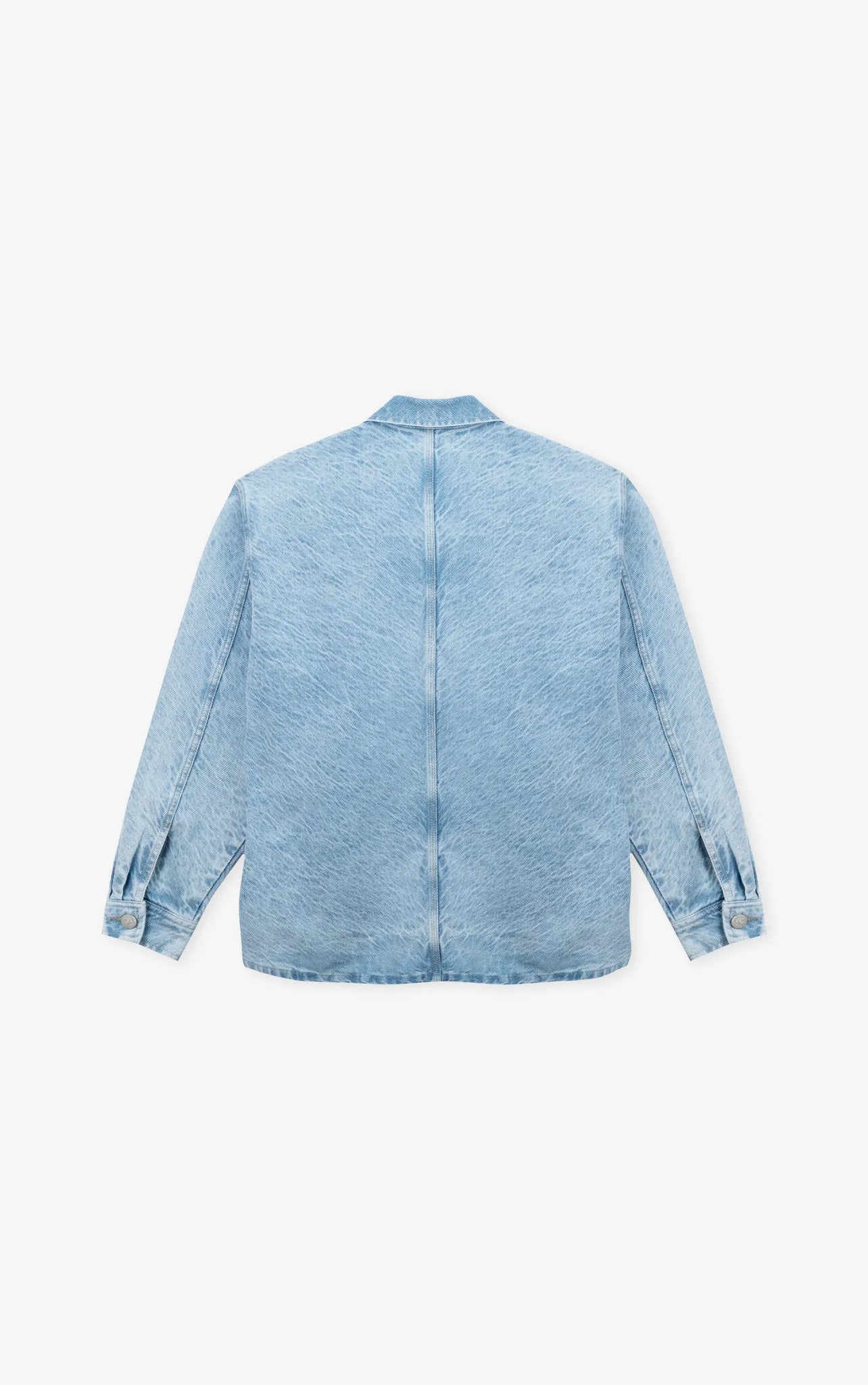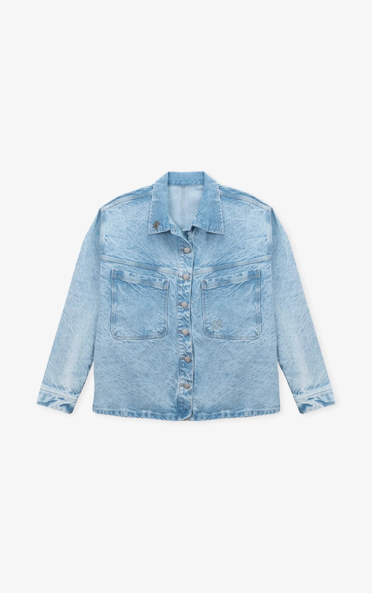 Chaqueta unisex confeccionada en denim de algodón lavado en tono azul claro, que aporta un acabado desgastado y un carácter contemporáneo. Su silueta recta y relajada permite usarla como sobrecamisa ligera o como capa exterior, ofreciendo versatilidad para distintos estilos. En el frente, cuenta con dos bolsillos de parche amplios en el pecho, costuras marcadas que realzan la estructura y un cierre frontal de botones metálicos personalizados.