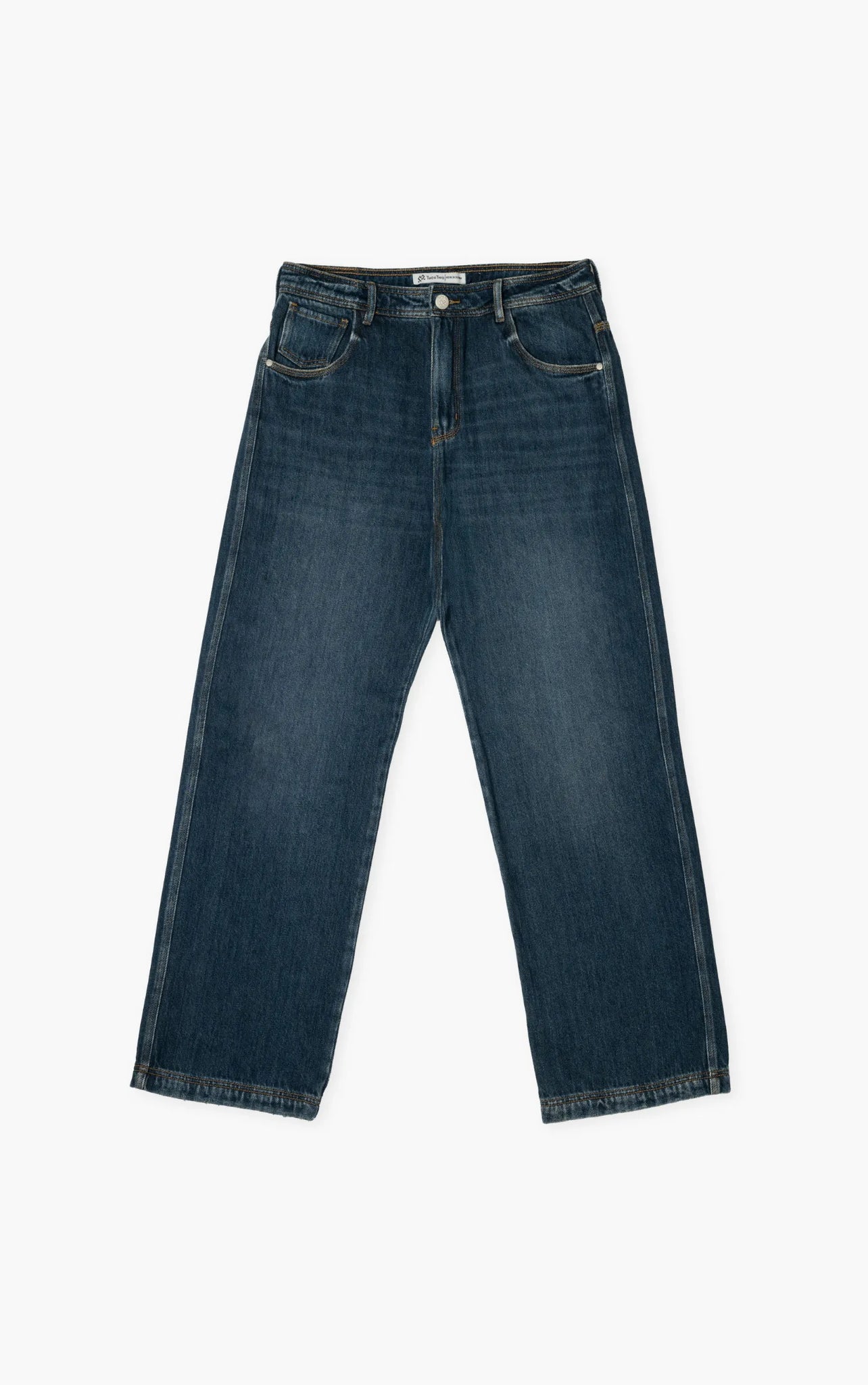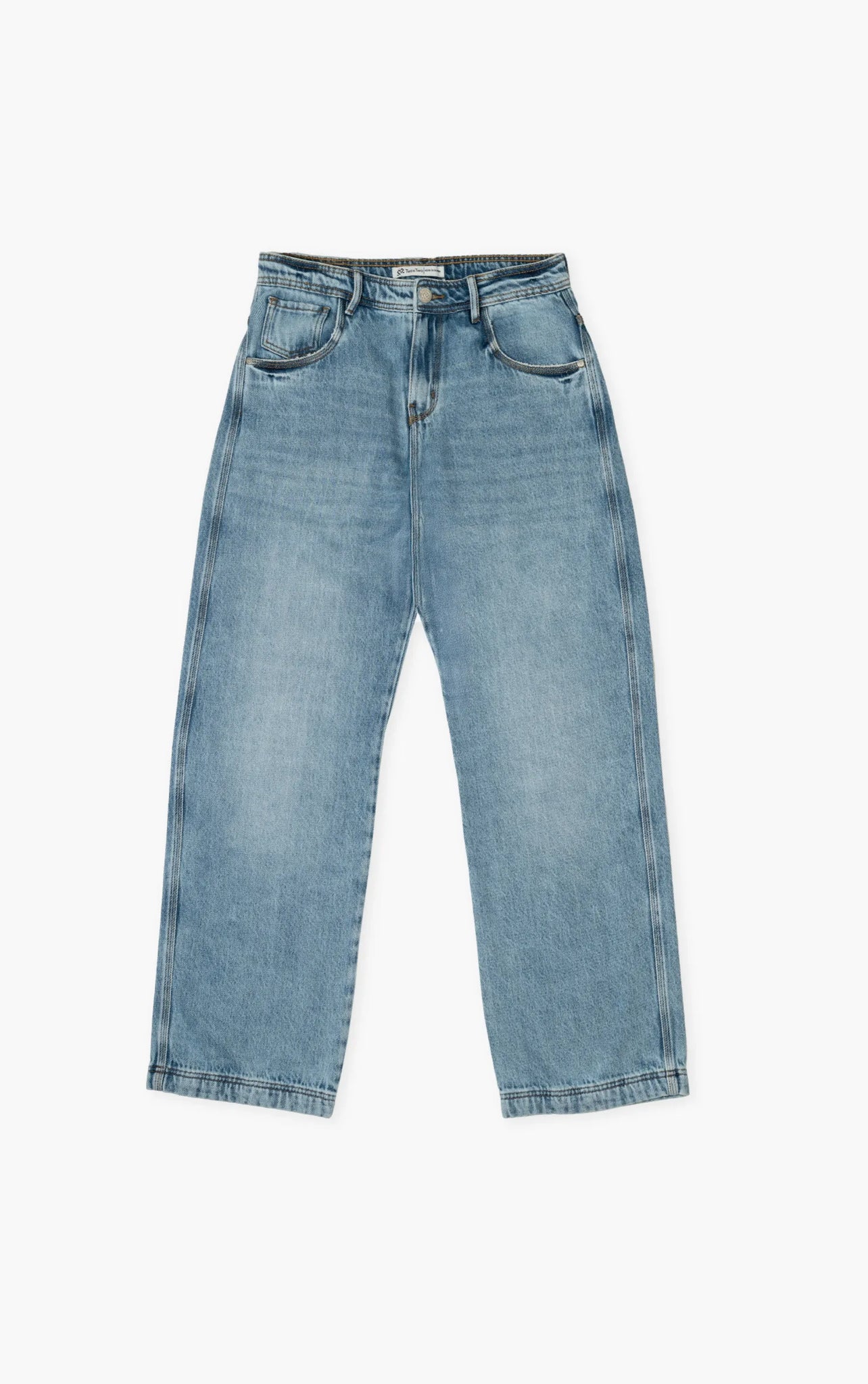 Jean baggy unisex en colores azul oscuro y medio, confeccionado en 100% algodón virgen, con una caída amplia y cómoda que mantiene un look urbano contemporáneo. Su diseño incorpora pretina semi anatómica para mejor ajuste de cintura, costuras con hilo de realce, textura diagonal 3x1 y botones en zamak resistente a la oxidación. El logo bordado con hilos reciclables aporta un detalle sutil y distintivo de la marca.